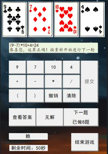24点游戏的趣味不仅限于四张牌的运算,随着游戏的推广,它也扩展到了更多张牌的场景中。你可以从牌堆中随机抽取n张牌(n>4),并尝试用这些牌的数值去拼出24点。在这种玩法中,数字组合的变化更为复杂,但解题的乐趣也随之倍增。